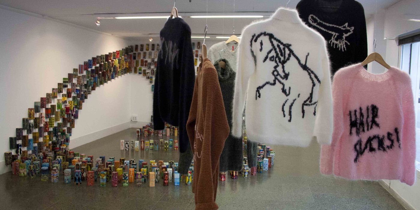 Esta bella pieza de indumentaria, junto a otras similarmente obtusas (en otro suéter distinguimos una felación y en un tercero el confuso grito de “Hair Sucks!”) son algunas de las obras que se exponen en el espacio NauArt, donde, bajo el título de The Hypnotist Collector, media docena de artistas estonios presentan sus creaciones. Encontramos una pintoresca alineación de tetrabriks de leche pintados, formando una espasmódica curva a lo largo del suelo y la pared, causando un mestizaje entre lo cotidiano y lo psicodélico. Un módem que cada minuto va emitiendo señales wi-fi que van configurando los versos de un poema de Eduard Escoffet (alrededor del cual se arrejuntan los visitantes, mirando sus teléfonos embobados). Una colección de pequeños óleos que ilustran búsquedas de imagen de Google (transexuales, un alien Roswell, celebrities y cosas tan aleatorias como sorprendentes). Un corto donde una doctoranda se enfrenta al significado del patriotismo y de las celebraciones nacionales – un tema, admitámoslo, fundamental ya que, cómo hemos mencionado, de forma muy argumentada (¡con citas y todo!), Estonia cuenta con una identidad propia históricamente marcada – y con unas celebraciones nacionales, el día de la victoria (23 de junio, la batalla de Võnnu, 1919, determinante en la guerra de independencia de Estonia) y el día de la declaración de la independencia (24 de febrero, 1918) muy arraigadas en la población. Las preguntas son: ¿hasta qué punto debemos asistir con la mente crítica a un desfile nacionalista? ¿Hasta qué punto el nacionalismo aún es vigente más allá de la emoción? Y, particularmente en el caso de la difusa Europa del Este, ¿cómo pueden solaparse y compartirse nacionalismos distintos en un mismo territorio?